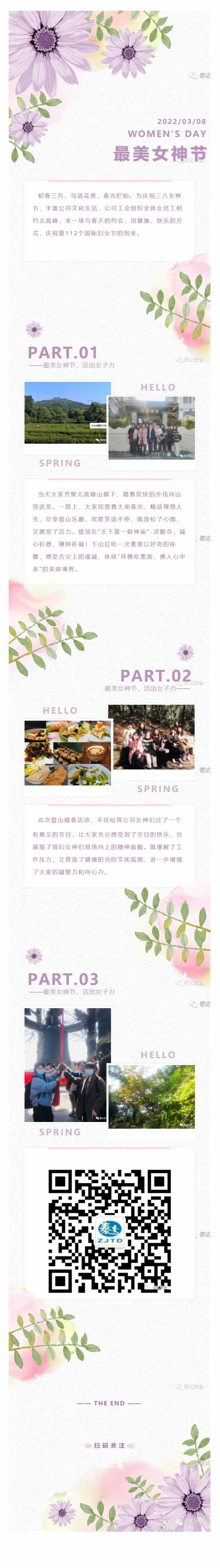 初春三月,鳥語花香,春光爛燦。為慶祝三八女神節(jié),豐富公司文化生活,公司工會組織全體女員工相約北高峰,來一場與春天的約會,用健康、快樂的方式,慶祝第112個國際婦女節(jié)的到來。